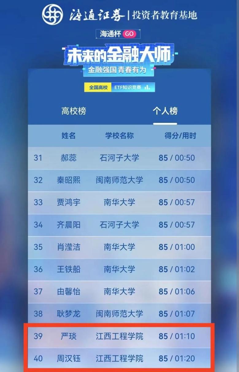 2024年5月7日晚上7点,首届海通杯“未来的金融大师全国高校ETF知识竞赛”新余赛区的启动仪式在江西工程学院天工校区南教学楼B栋106教室隆重举行。在数字经济产业学院领导的悉心指导和金融教研室老师的精心组织下,近100名学子踊跃参与了本次比赛。在随后的打榜赛中,我院有四名学子脱颖而出,跻身全国百强。