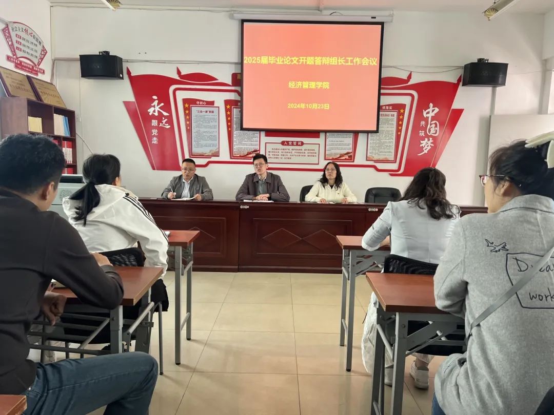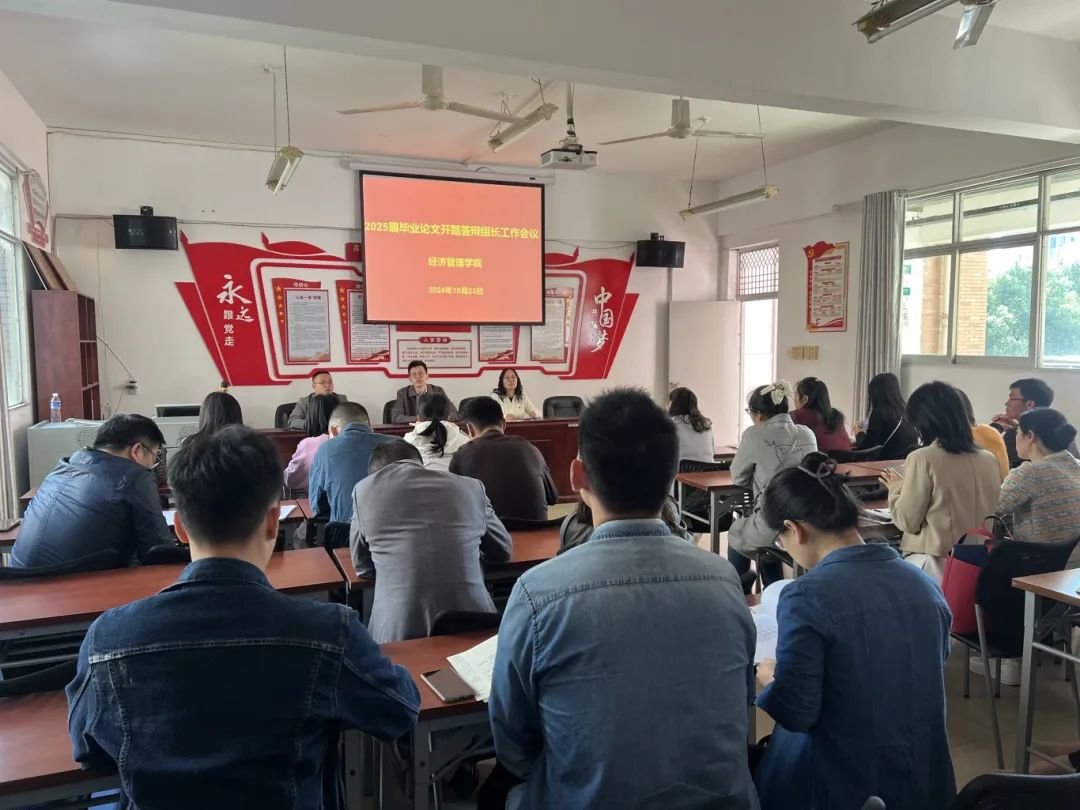 为进一步确保毕业论文开题答辩高质量完成,强化教学质量管理,扎实做好我院2025届毕业论文开题答辩工作,保障其规范化、有序化开展。10月23日上午,经济管理学院召开2025届毕业论文开题答辩组长工作会议,会议由院长谭文武主持,副院长朱伙军、邹莉及学院答辩组长参加。