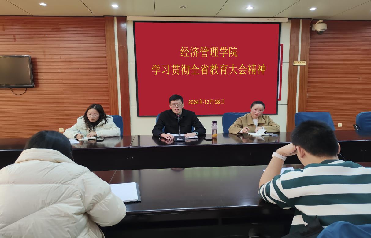 为深入学习贯彻全省教育大会精神,进一步提升教师队伍的专业素养和管理水平,推动学院教育事业高质量发展。12月18日,经济管理学院在图书馆403会议室组织学习贯彻全省教育大会精神。由院长谭文武主持,党总支书记张文凤、副院长邹莉及全体教师参加。