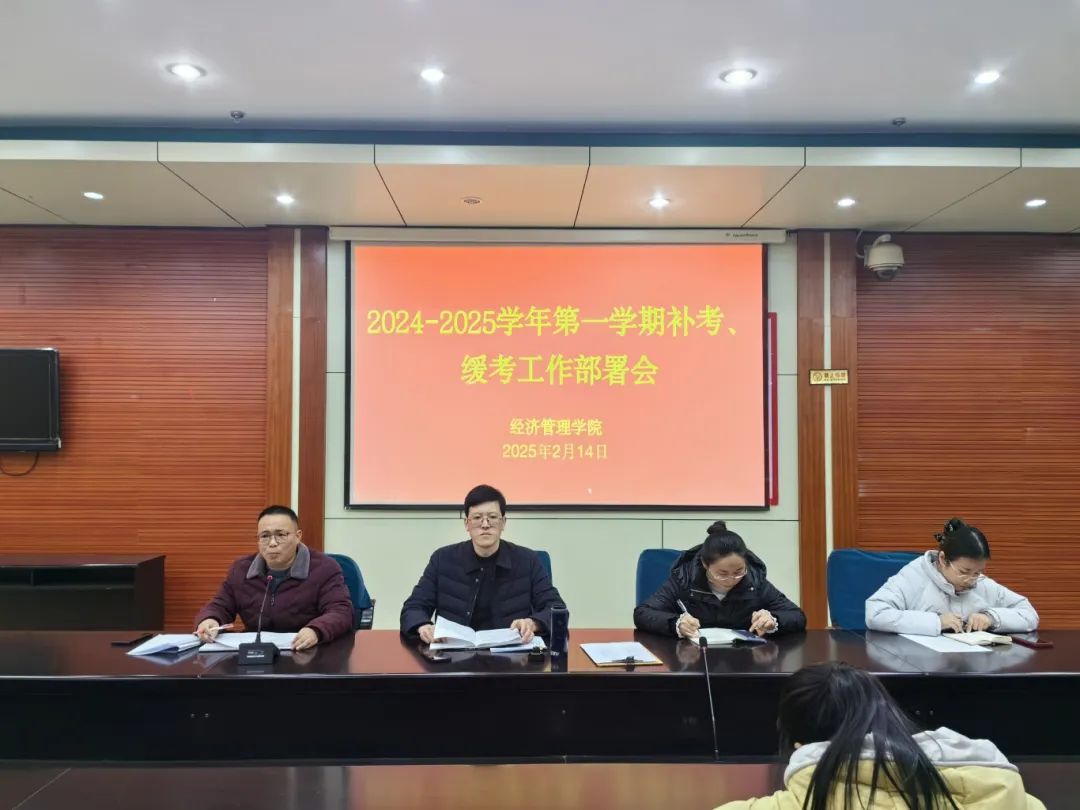 为进一步加强学院考试管理工作,端正考风、严肃考试纪律,确保2024-2025学年第一学期补考、缓考工作平稳有序开展。2025年2月14日,经济管理学院在图书馆403会议室召开2024-2025学年第一学期补考、缓考工作部署会,会议由院长谭文武主持,党总支书记张文凤、副院长朱伙军、邹莉及全体教师参加。