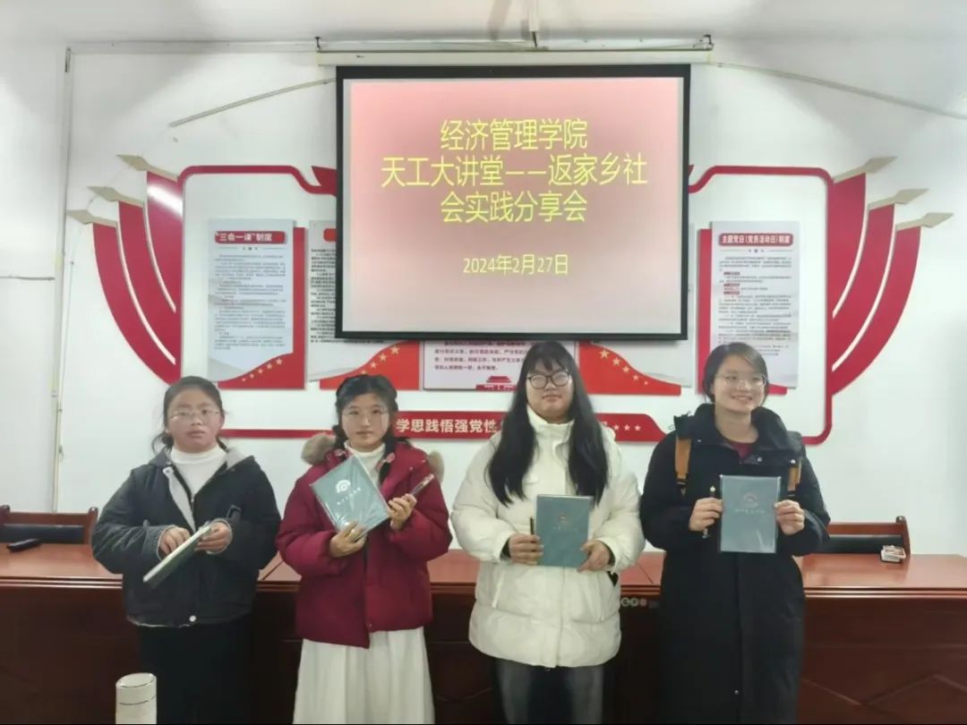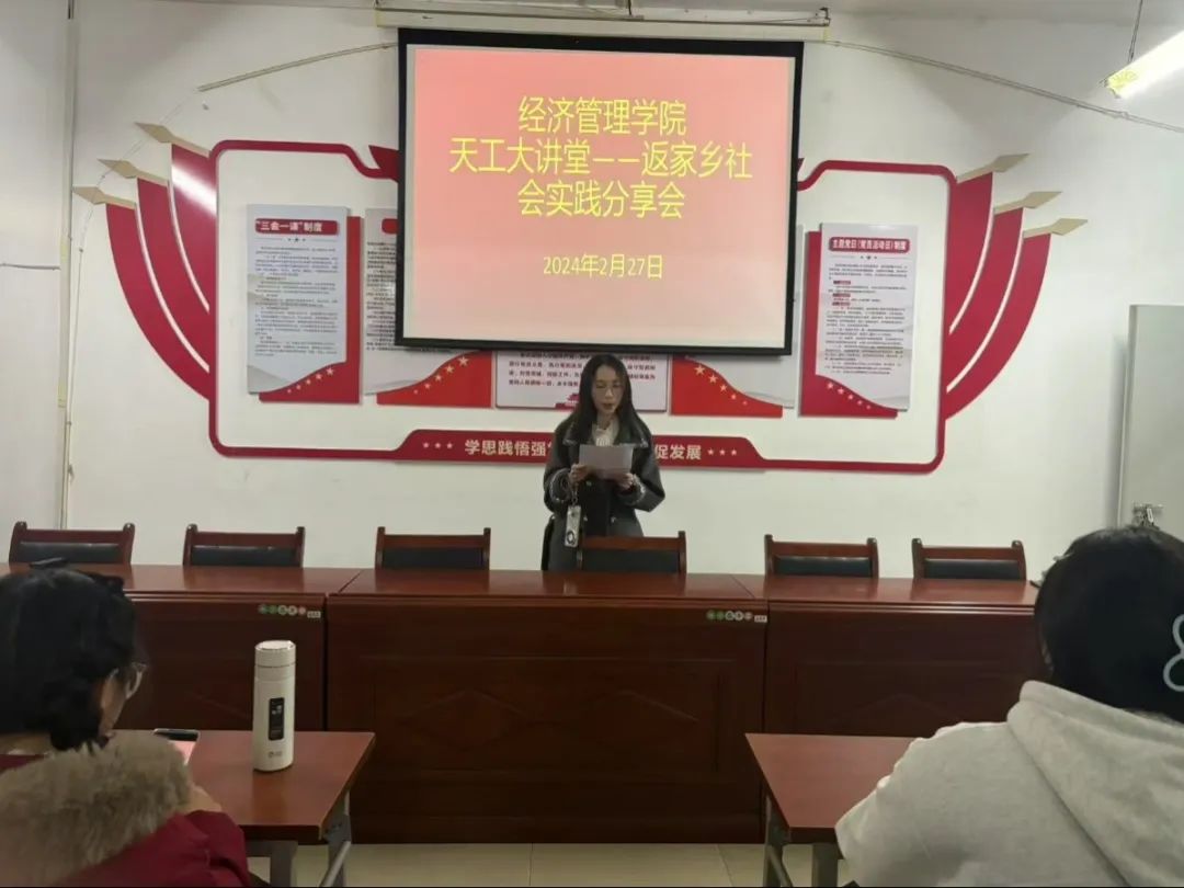 为深入学习宣传贯彻习近平总书记关于青年工作的重要思想,进一步动员引领青年学生在投身基层建设、服务家乡发展中坚定信念、增长本领、做出贡献,在寒假期间,经济管理学院组织学生开展了“返家乡”社会实践活动。为充分发挥优秀实践成果的示范引领作用,促进经验交流与传承,巩固实践教育成果,经济管理学院于2025年2月27日晚上在A栋401活动室成功举办了“天工大讲堂-返家乡”社会实践经验分享会,同学们积极参与。本次分享会由学院团总支学生会组织部地康莘主持。