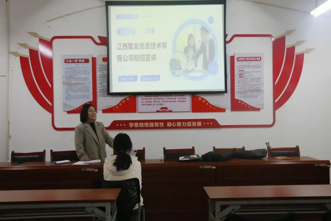 招聘会上,江西聚友信息技术有限公司负责人通过播放宣传片、PPT展示等方式,向同学们详细介绍了公司的发展历程、企业文化、业务范围以及未来发展规划。在岗位介绍环节,负责人对招聘岗位的职责、任职要求、职业发展路径以及薪酬福利体系进行了全面解读,为不同专业方向的学生明晰了就业选择。
