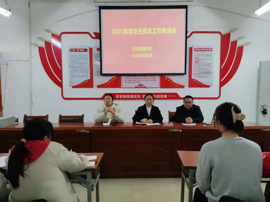 为了加速推进2025届毕业生的就业进程,紧抓春季学期这一就业推进的黄金时段,经济管理学院致力于细化就业工作的各项准则,提升就业指导服务的品质,激发毕业生的求职积极性与主动性,力求为2025届毕业生打造一个充分且高质量的就业环境。经济管理学院于3月3日召开毕业生就业工作推进会。此次会议旨在总结前期就业工作经验,分析当前就业形势,明确下一阶段就业工作目标,并部署下一步具体的工作。会议由党总支书记张文凤主持,副院长朱伙军、邹莉及全体毕业班辅导员(班主任)参加。