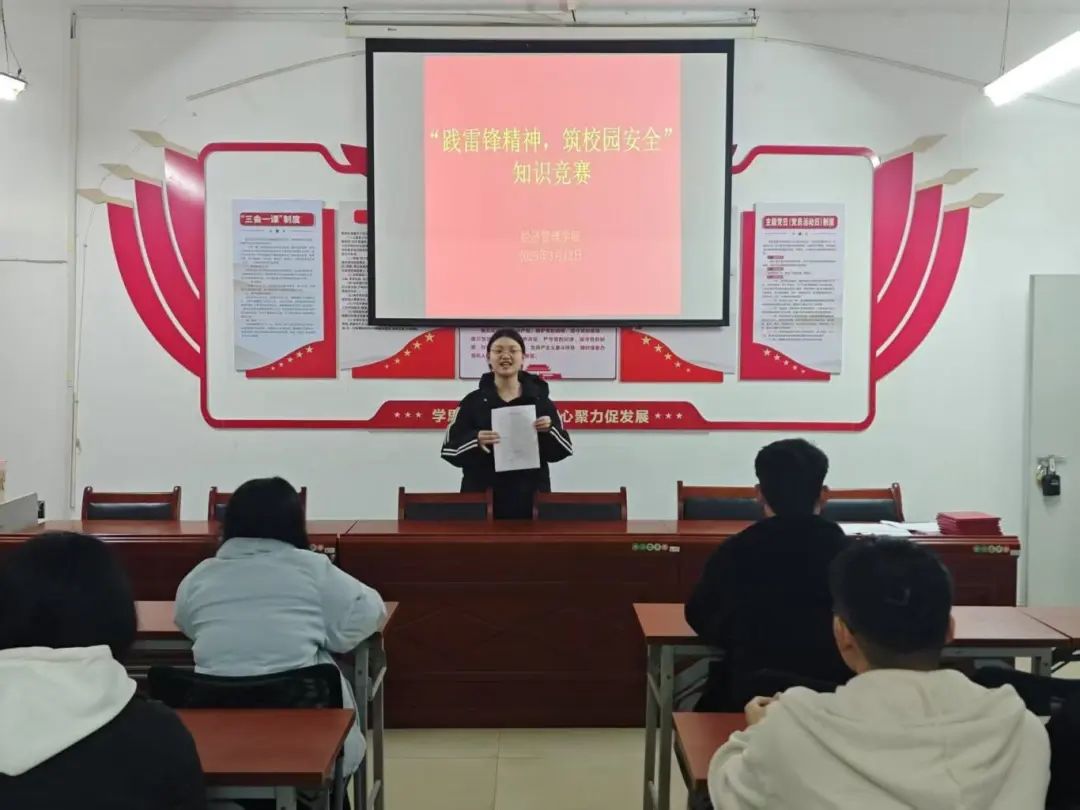 为传承雷锋精神,增强学生校园安全意识,2025年3月12日晚上七点,经济管理学院在A栋教学楼401会议室举办 “践雷锋精神,筑校园安全” 知识竞赛活动。本次知识竞赛活动由经济管理学院2022级、2023级、2024级学生参加。