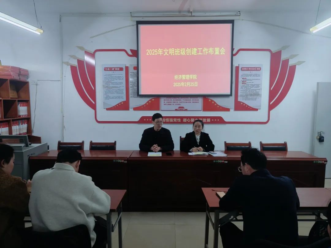 为进一步加强学院班级建设,提升班级凝聚力和向心力,营造积极向上、文明和谐的班级氛围,提高同学们学习的积极性和主动性,促进同学们的综合素质的全面提高,3月2日,经济管理学院于A401会议室召开了2025年文明班级创建工作部署会。会议由院长谭文武主持,党总支书记张文凤及全体辅导员(班主任)参加。