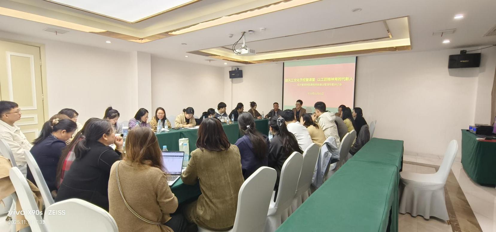 为深入推进课程思政建设,明晰天工文化、工匠精神与经管类课程的融合逻辑,构建闭环管理体系,2025年11月11日,经济管理学院召开“融天工文化于经管课堂,以工匠精神培育时代新人——课程思政建设管理专题研讨会”。学院院长谭文武、书记张文凤、副院长朱伙军、邹莉及各教研室主任、学科带头人、骨干教师等30名教师参会,会议历时三小时,共话课程思政建设新路径,氛围热烈而务实。