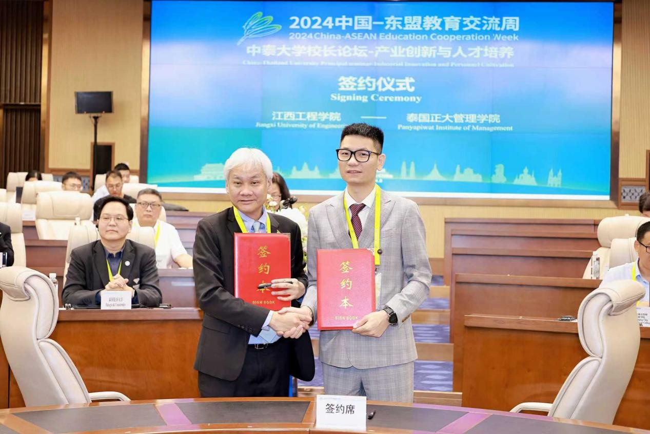 乐俊杰在与东盟高校的交流中,详细介绍了江西工程学院的办学理念、学科建设、科研成果等情况,同时也了解了东盟高校的人才培养模式、科研情况和国际合作项目。乐俊杰代表学校与泰国正大管理学院就进一步加强学术交流、教师培训、学生交换、联合研究、产教融合等合作项目达成了初步共识并分别签署合作协议和谅解备忘录。