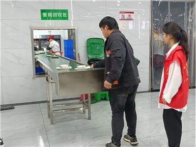 临近中午,结束了一上午课程的师生们陆陆续续进入食堂就餐,安静的食堂顿时热闹了起来。走进食堂,墙上贴示有“珍惜粮食,反对浪费”的宣传标语,时刻提醒师生们在生活中要节俭,勿浪费的餐饮习惯。食堂各楼层也都有青协部安排的学生志愿者,他们时刻都在提醒取餐的同学们“适量点餐,不够再加”,并对餐盘中剩饭剩菜较多的同学进行文明劝导。面带微笑用温馨的话语告诉在食堂就餐的同学们自觉把餐具放到回收处,看到同学们一个接一个的把光盘的餐具放到回收处,充分展现了一个大学生的良好素质。同时,同学们良好的文明习惯也给在食堂工作的阿姨们减轻了负担。