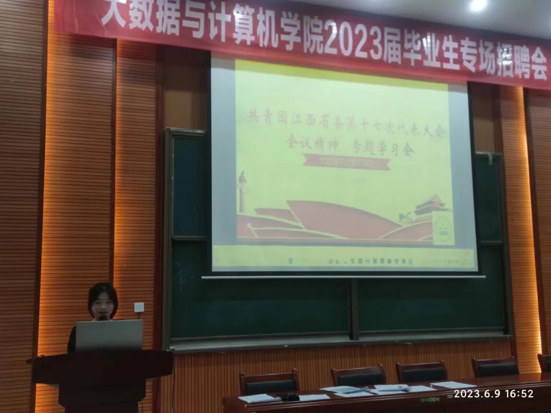 为了传达学习江西省第十七次团代会精神,勉励广大青年时刻牢记嘱托,勇担职责使命,争当时代先锋,6月9日,大数据与计算机学院于二楼学术报告厅组织开展“省第十七次团代会精神”学习交流会活动,此次活动由我院团总支书记林稳主持,全体团员青年参加。