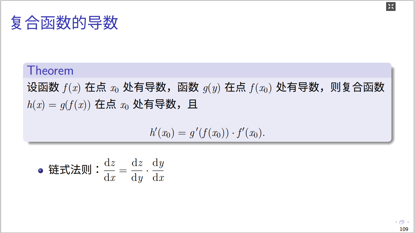 定理:设函数在点处有导数,函数在点处有导数,则复合函数在点处有导数,且