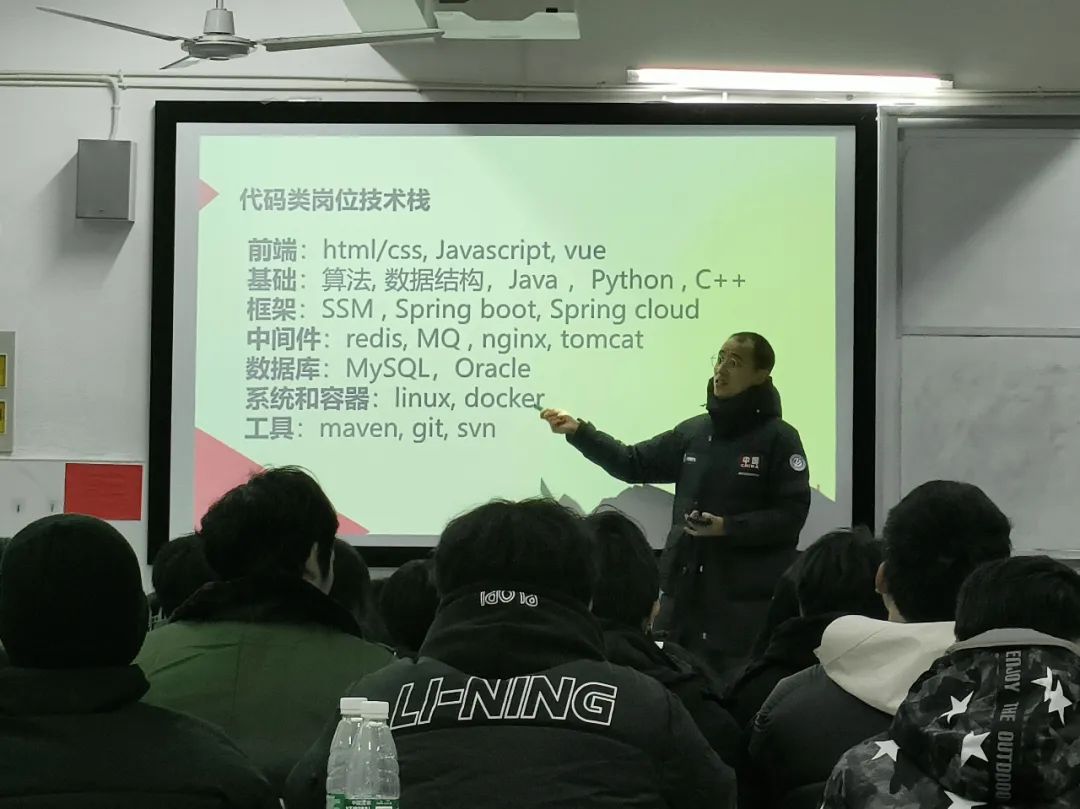 首先,江勇向同学们详细介绍了移动互联网、大数据、人工智能、行业信息化、云计算以及物联网在目前的发展趋势,让同学们能够根据自己所学的专业去找到合适的工作。其中,他重点讲述的是行业信息化。他表明,信息化行业是非常广泛的,但最重要的是要做好基础设施,也就是说,基础才能决定你能力的下限。