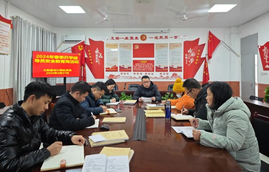 为了强化安全教育,细化安全管理,防控安全风险,关注师生身心健康,进一步增强安全防范意识,提高师生自我保护和应急的能力,上好开学第一课,大数据与计算机学院根据文件的相关要求于2024年2月27日在教学楼B504开展“安全教育周”系列活动的会议。会议由党总支书记王娟主持,学院院长巢喜剑出席会议,各班辅导员班主任参加。