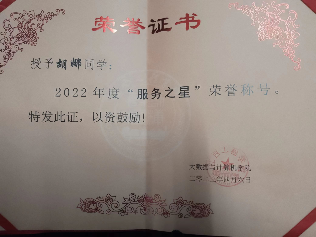 胡娜,共青团员,江西上饶人,大数据与计算机学院2021级计算机科学与技术本科三班学生。在校期间,她一直保持着积极的学习态度,努力追求知识的积累和技能的提升,并积极参与各种活动,始终以提升自己的综合素质为目标,以自我的全面发展为努力方向。
