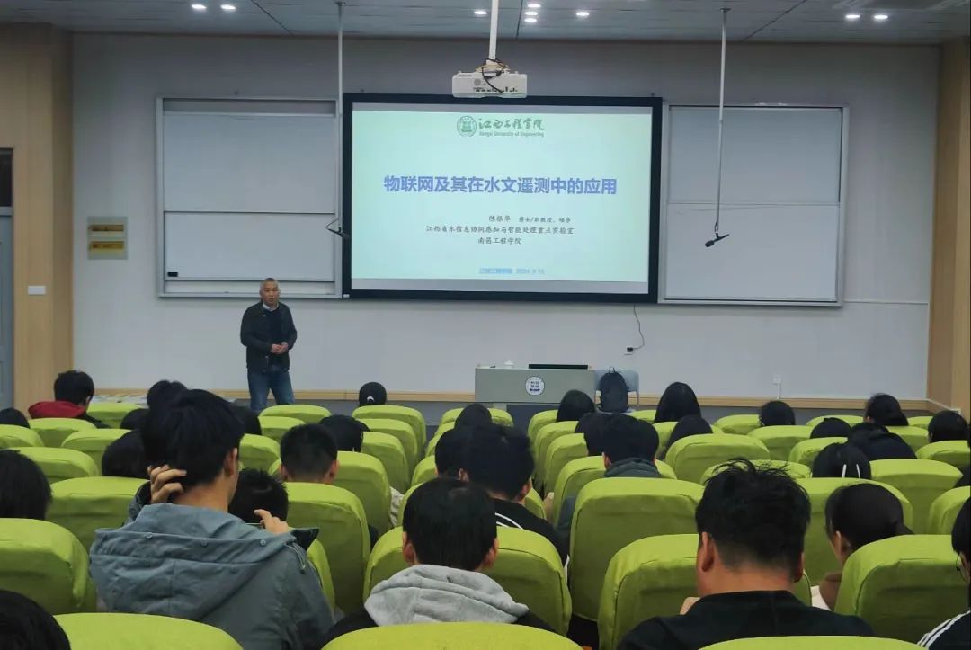 讲座中,陈博士围绕“物联网及其在水文遥测中的应用”的议题分别进行了从水信息概述、物联网技术、基于物联网的水文遥测终端设计、已开发其他设备与系统、发展与期望等方面进行了深入浅出地分析解读,层层深入,把高深复杂的知识以通俗易懂的语言传授给在场学生。并且,他还解释了物联网的本质、特征、体系结构,这期间他提到云计算、边缘计算这两个专业术语,又向在场学生补充什么是“云”,为了让学生们更好地理解,他用共享这个词来对比,让学生们很好地了解了“云”的本质。
