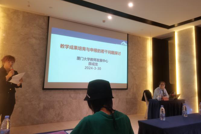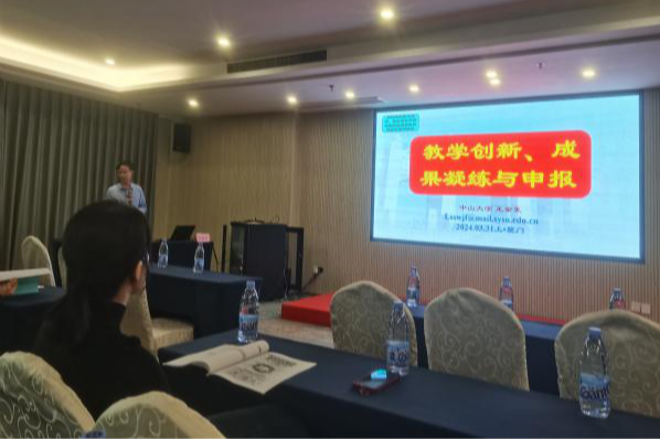 本次培训主要由厦门大学薛成龙和陈武元、中山大学王金发等教授围绕教改项目的选题设计、教学改革与研究项目申报与实施、教学成果奖的总结与申报技巧和注意事项、教研论文的写作方法与技巧和教学成果奖凝炼与申报案例分享。其中薛成龙教授强调“教学成果奖 是教育工作者在实践中总结出来反映教育教学规律,具有独创性、新颖性、实用性,对提高教学水平和教育质量、实现培养目标产生明显效果的教育教学方案”。