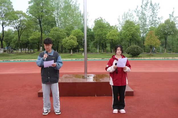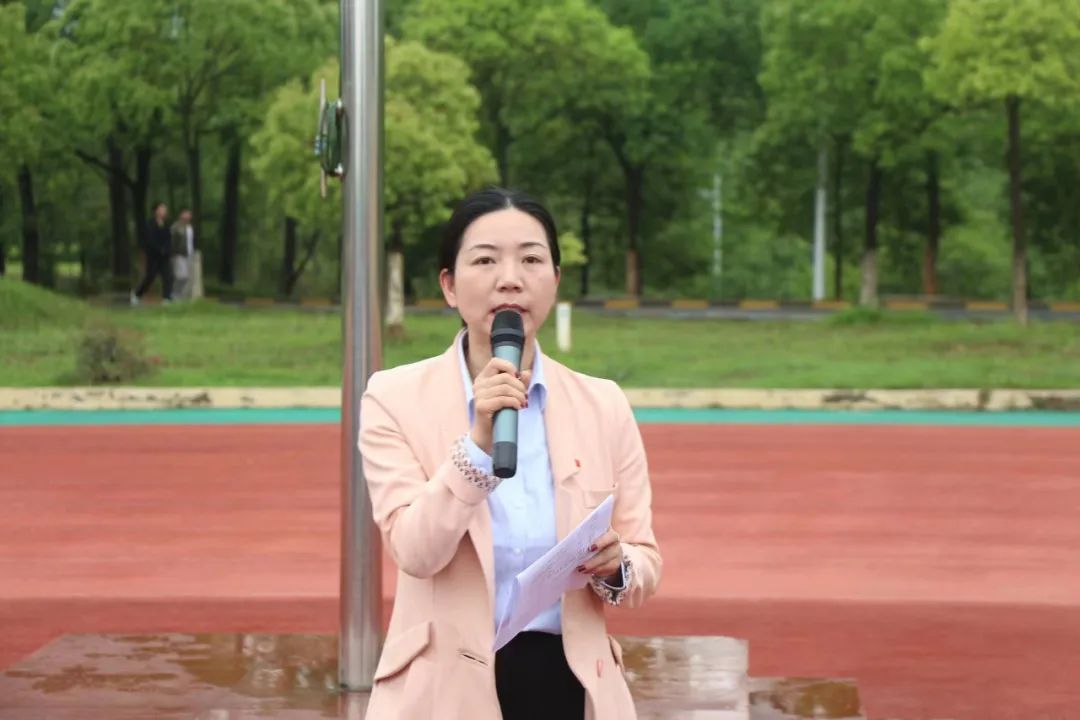 王娟主持宣布升旗仪式开始,鲜艳的五星红旗,伴随着激昂雄壮的《义勇军进行曲》响彻全场,全体师生衣着整齐,表情庄重严肃,高声歌唱着国歌,与此同时,五星红旗冉冉升起。
