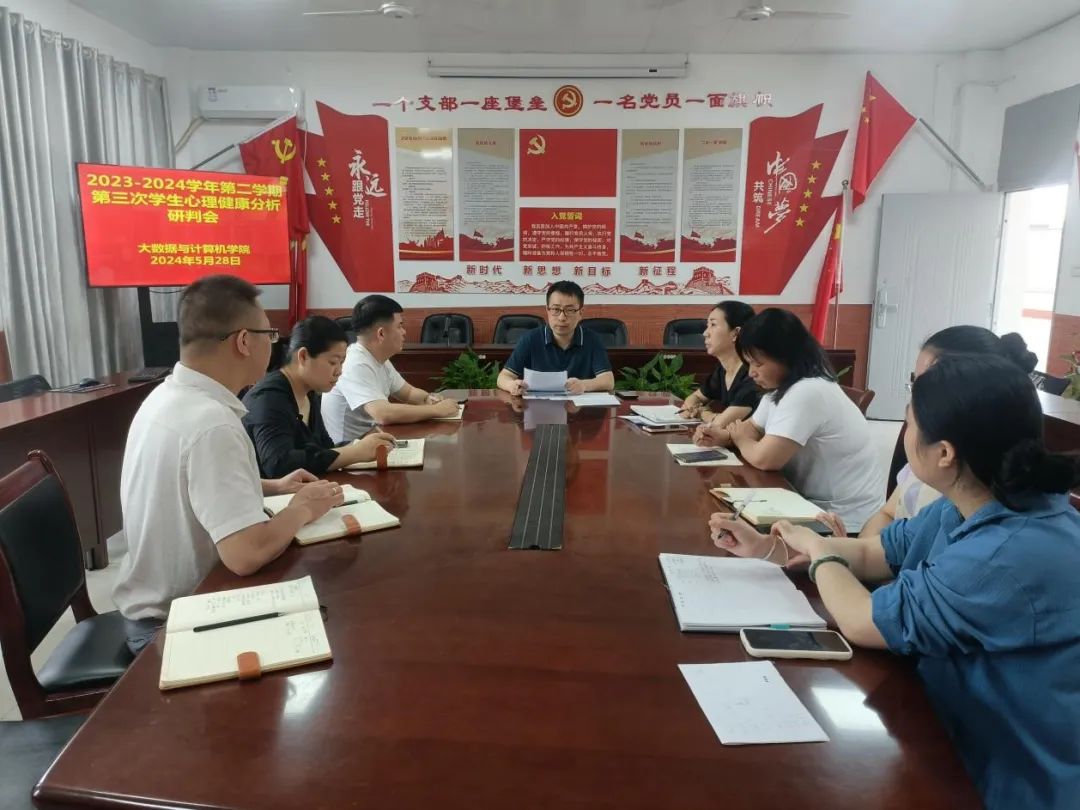 为加强对在校学生心理状况的关注和研判,进一步提高心理健康教育工作的针对性和实效性,筑牢学生心理健康防线,大数据与计算机学院于2024年5月28日下午,在B504召开2023-2024学年第二学期第三次学生心理健康分析研判会。此次会议由我院党总支书记王娟主持,我院院长巢喜剑出席会议,各班辅导员按时参加。