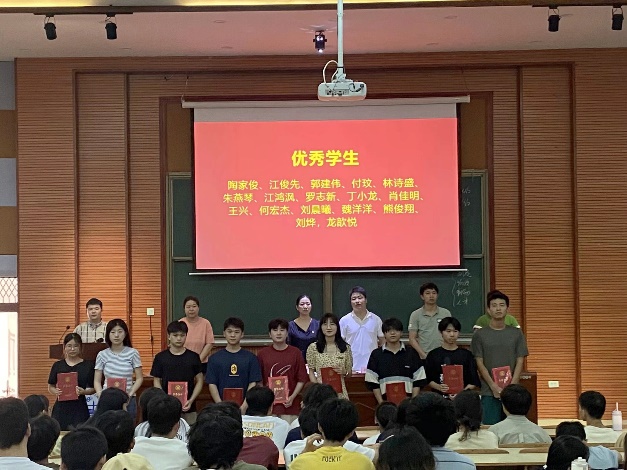 会议第三项,颁奖环节。由王娟、郑智山、辅导员代表为获奖学生颁发荣誉证书及奖品。