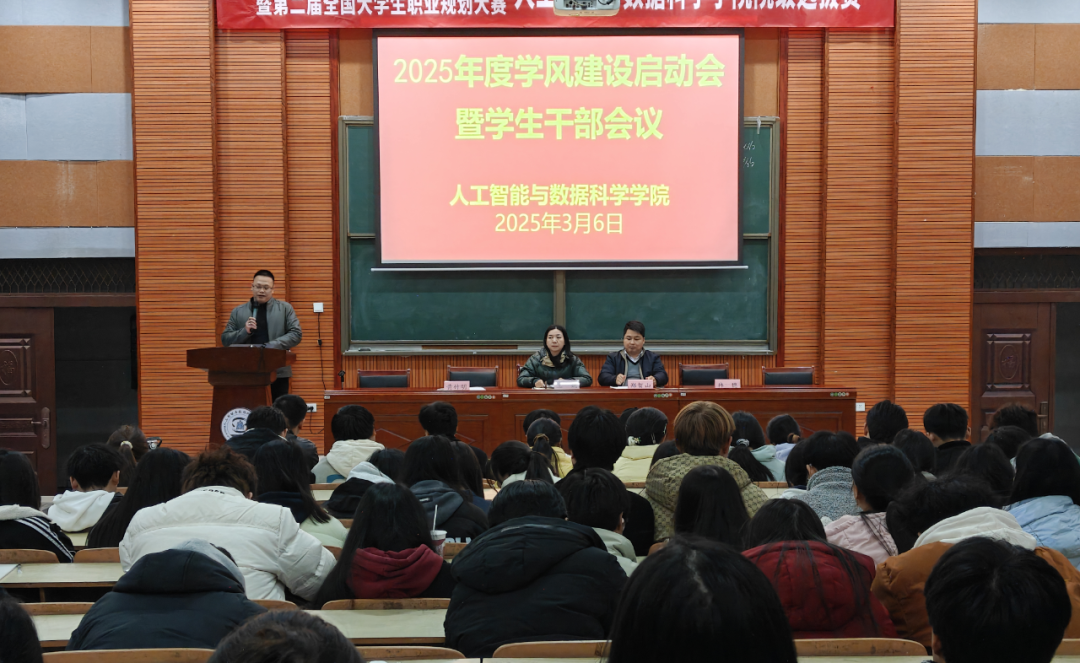 为明确学风建设的目标与方向,凝聚团队力量,提升学院干部能力,3月6日,人工智能与数据科学学院于二楼报告厅召开2025年度学风建设启动会暨学生干部会议。此次会议有党总支书记王娟,党总支副书记郑智山,办公室主任黄竹明出席,由团总支书记林稳主持,各班辅导员、班主任以及各班学生干部参与。