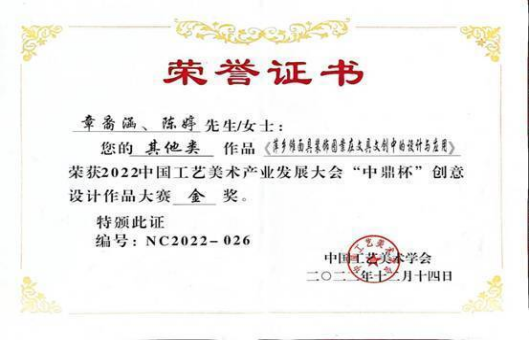 “中鼎杯”是中国工艺美术界的高艺术水平赛事和高权威的荣誉。近日,从中国工艺美术学会举办的中国工艺美术产业发展大会“中鼎杯”获悉,江西工程学院抱石艺术学院教师团队斩获三金两银。其中获奖老师有章裔涵、廖超萍、钱柏英、李莲。