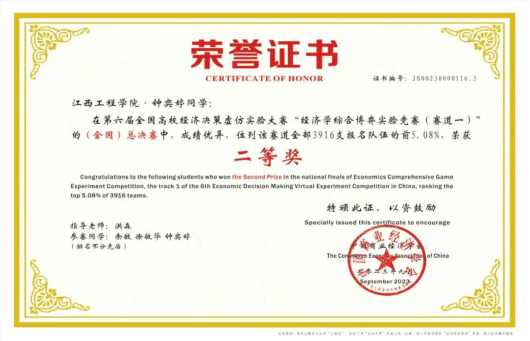 9月9日,2023年(第六届)全国高校经济决策虚仿实验大赛全国总决赛顺利落下帷幕,经过激烈竞争,江西工程学院经济管理学院代表队在经济学综合博弈实验赛道3916支队伍中脱颖而出,获得2个全国一等奖、2个全国二等奖优异成绩,4个代表队100%获奖。