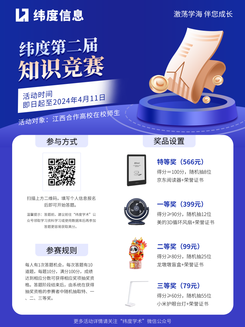 温馨提示:答题之前,可前往“纬度学术”公众号查看学习资料或使用数据库后再参加竞赛,更容易获取高分。
