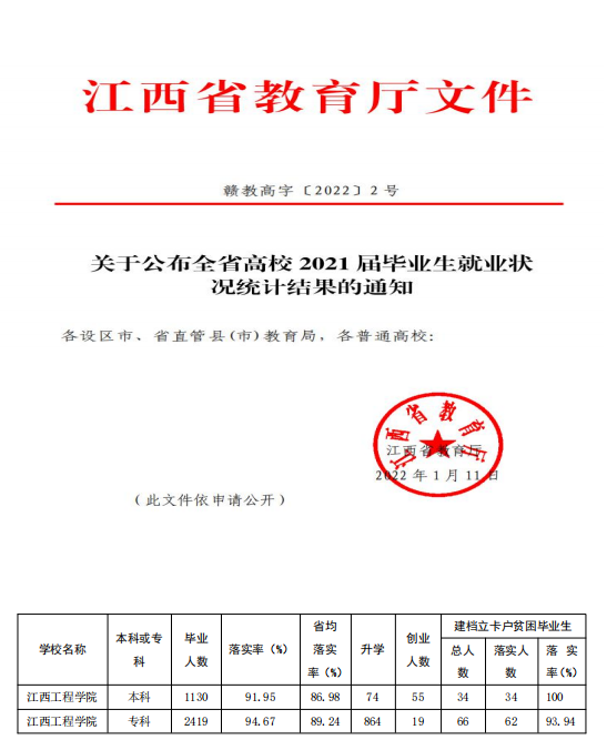 2022年元月11日,江西省教育厅公布了《全省高校2021届毕业生就业状况统计结果》。2021年度我校共有毕业生3549人,在校领导及各教学院领导、各位老师的大力支持下,我校本专毕业生就业工作取得不俗的成绩。2021届本科毕业生初次毕业去向落实率为91.95%,全省排名第六,同类院校排名第二,其中“建档立卡”贫困毕业生毕业去向落实率为100%;专科毕业生初次毕业去向落实率为94.67%,全省排名第四,同类院校排名第三,其中“建档立卡”贫困毕业生毕业去向落实率达到93%。以上数据显示,我校2021届毕业去向落实率远高于省均毕业去向落实率。2021届毕业生创业人数74人,全省排名靠前;考研录取人数为74人,其中10人进入双一流高校就读。疫情环境下国民经济发展受阻和防疫防控常态化,就业工作取得如此成绩实属不易。