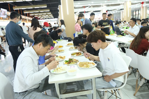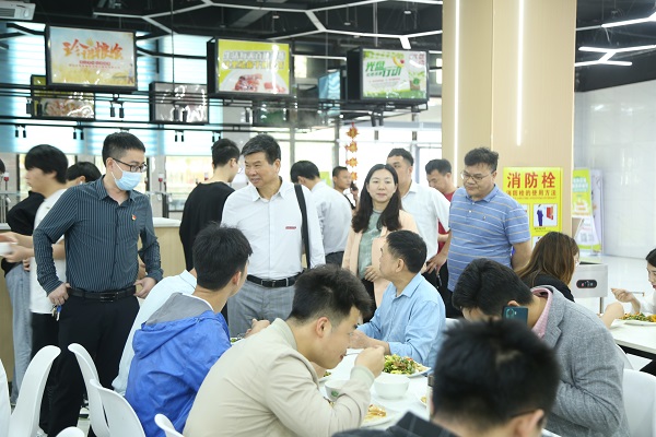 接着,杨名权董事长走进食堂,看到用餐的老师、同学,都亲切地上去询问:“饭菜口味怎么样?”、“饭菜价钱贵不贵呀?”,然后便坐下来和同学们沟通交流,期间还不忘给同学们亲切添菜。
