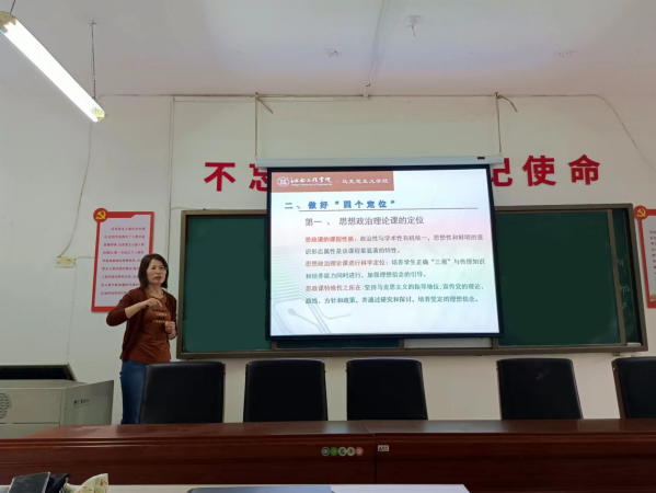 占顺霞首先引用习近平总书记在中国人民大学视察重要讲话精神,即“为谁培养人、培养什么人、怎样培养人”始终是教育的根本问题。作为一名思政教师,上好思政课对于国家、学校、个人三个层面的重要性,从总体上谈了个人的认识。接下来对于思政教师“如何站住、站稳、站好讲台”,占顺霞结合自己多年教学经验,分别从“四个定位”即“思想政治理论课、应用型本科院校、思政课教师要求、上好思政课的关键”四个方面做了详细讲解。其中谈到“思政课教师要求的定位”时,占顺霞表示,作为一名高校思政课教师要做好“守正创新”,坚持“学术研究无禁区、课堂讲授有纪律”,要做到“三个底线,四个不能”等要求。同时她还讲到,我们思政教师要把习近平总书记此次视察重要讲话时强调的“坚持党的领导,坚持马克思主义指导地位,坚持为党和人民事业服务,落实立德树人根本任务”贯穿到自己的教育教学当中去。在上好思政课的关键定位方面,占顺霞结合自己在实际教学中的感悟,总结了“两性”“两力”(即“实效性和趣味性”、“吸引力和感染力”)的有关要求,同时进一步分享了在确立青年大学生在思想政治教育中的主体地位,解决思政课教学中教师主导与学生主体的矛盾,实现思政课教学上由权威型向对话型转换的教学方法等。