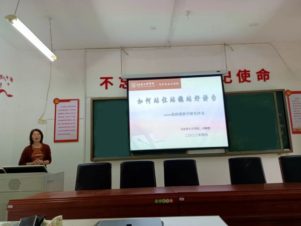 为进一步深入学习贯彻习近平总书记在中国人民大学视察重要讲话精神,迎接我校本科教学工作合格评估,更好提升思政教师教学实践能力,同时加快学院师资队伍建设。2022年4月28日,马克思主义学院举办了以“如何站住、站稳、站好讲台”为主题的思政教学研讨沙龙活动。本次活动由副院长胡延庆主持,占顺霞副教授主讲,马克思主义学院全体教师参加了此次活动。