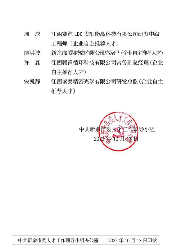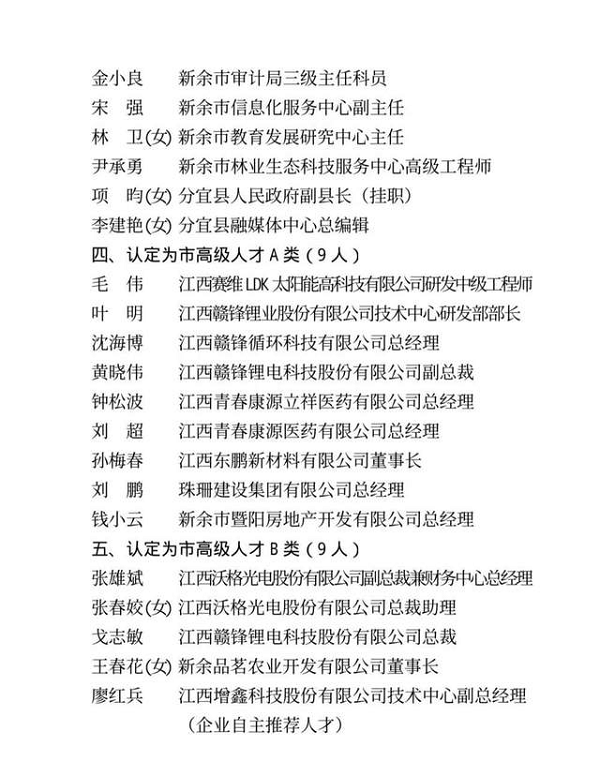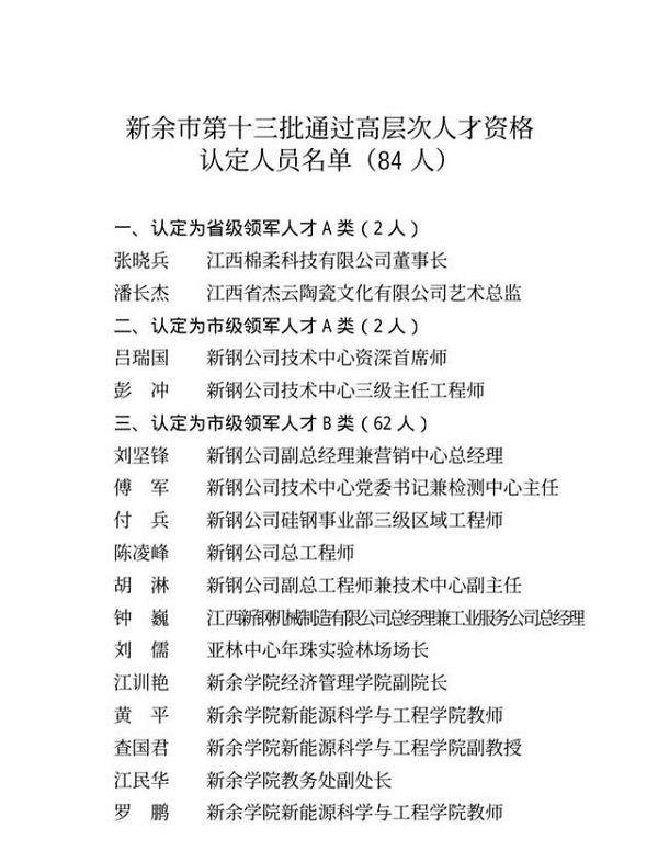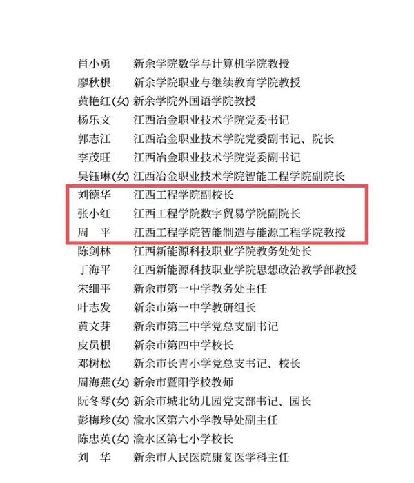 近日,中共新余市委人才工作领导小组公示了第十三批“新余市高层次人才”认定名单,张晓兵等84人为“新余市第十三批高层次人才”, 其中,我校副校长刘德华、数字贸易学院副院长张小红、智能制造与能源工程学院教授周平入选市级B类领军人才。