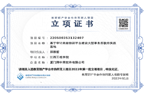 “基于审计岗前特训平台建设大型事务所校外实践基地”,项目编号:220500353132407,项目预计投入经费5万元,其中,厦门网中网软件有限公司资助5万元。