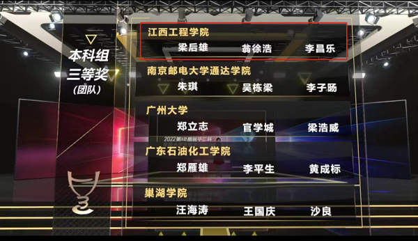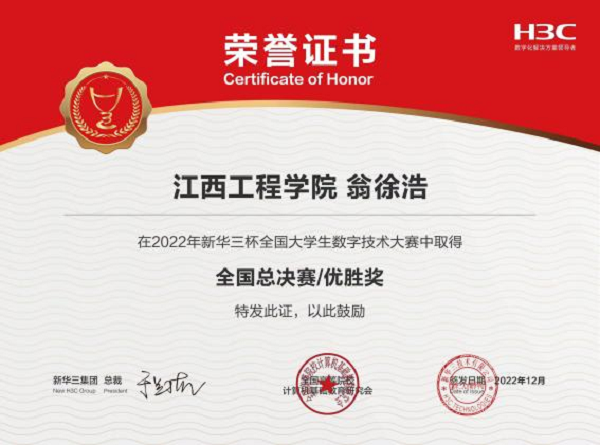 全国大学生数字技术大赛是高校教育教学改革和创新人才培养的重要竞赛项目。大赛“以赛促学习、以赛促教学、以赛促就业”,积极探索高科技技术人才培养思路。而在这一目标的指引下,大赛已成为IT业界最受欢迎、含金量最高、最有影响力的赛事活动之一。经过激烈的角逐,江西工程学院大数据与计算机学院(华为ICT产业学院)19级数据科学专业三名同学在经过江西赛区选拔后,以省赛一等奖的优异表现成功入围全国总决赛并全部获奖,团队赛中,由梁后雄、翁徐浩、李昌乐组成的队伍获得本科组三等奖;个人赛中,翁徐浩获得优胜奖。