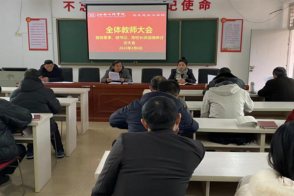 马克思主义学院:2月6日下午,马克思主义学院召开全体教师大会,围绕如何贯彻落实好会议精神,加强学院建设,教师纷纷结合各自工作,进行讨论交流。教授代表、各位教研室主任围绕各位领导的讲话内容,结合教研室工作现状、学科课程特色等方面发表了自己的感想。胡延庆副院长结合教学工作,从排课、磨课、培训等方面部署了当前教学工作。方妙薇副书记结合思政工作测评和意识形态工作考核等方面谈经验谈看法。