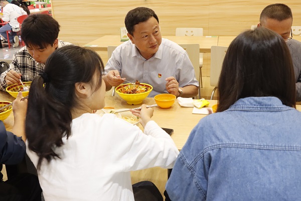 “希望你们珍惜时代际遇,不负青春韶华,深刻领悟‘两个确立’的决定性意义,进一步增强‘四个意识’、坚定‘四个自信’、做到‘两个维护’,在新征程上书写璀璨的青春华章。”5月22日晚上,胡涌书记来到学校中心食堂,和老师、同学们一起同桌用餐,亲切询问大家平日对学校食堂饭菜的感受和对校园管理方面的建议,勉励同学们珍惜大学时光,坚定理想信念,保持健康心态,度过充实而有意义的大学生活。