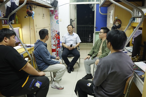 “生活还习惯吗?平常给父母打电话么?”“学校伙食味道如何?”“大家还有什么问题都可以向我提”来到学生宿舍,胡涌书记与同学们热情攀谈了起来。“教室换了新的课桌椅,中心食堂改造一新,饭菜比以前便宜了不少,我们很开心”“这两天图书馆人有点多,好多同学在考研自习室看书”“我们之前提的愿望都实现了,感谢领导老师想着我们”同学们如数家珍般谈起学校的新变化,喜悦之情和对领导老师们的感激之情溢于言表。