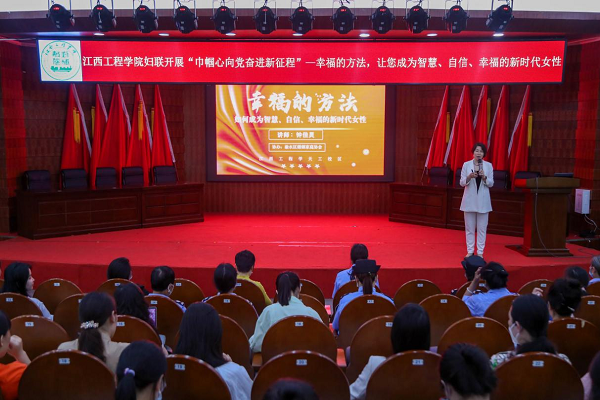 为深入学习贯彻党的二十大精神,引领女教职员工树立乐观向上的心态,凝心聚力投身于学校高质量发展建设和家庭建设中,江西工程学院妇联于5月25日下午在天工校区一楼学术报告厅组织开展“巾帼心向党 奋进新征程”学习宣传活动系列讲座。讲座邀请新余市渝水区婚姻家庭协会副会长钟佳灵为女教职员工们开展题为《幸福的方法——如何成为智慧、自信、幸福的新时代女性》的专题讲座。讲座由妇联主席李雯蕊主持,全校100余名女教职员工参加了讲座。