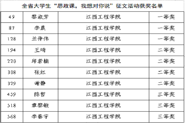 为深入学习贯彻习近平新时代中国特色社会主义思想,全面贯彻落实习近平总书记在学校思想政治理论课教师座谈会上的重要讲话精神。根据江西省教育厅《关于开展全省大学生“思政课,我想对你说”征文和“青春之问”征集活动的通知》安排,经评审,我校报送的作品获评“青春之问”征集活动6条(其中一等奖2名,三等奖4名)。获评“思政课,我想对你说”征文活动10篇(其中一等奖3名,二等奖4名,三等奖3名),“思政课,我想对你说”征文活动获奖篇数在全省民办院校中与其他两所同类院校并列第一。