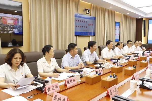 邓军表示,近年来,桂林理工大学坚持“七个聚焦”,大力实施“七大工程”推动学校党的建设与思想政治工作取得新的成效,学校已建设成为坚持党的领导的坚强阵地,先后获批全区党建工作示范校、全区清廉学校建设示范校、全区依法治校示范校、全区“三全育人”综合改革示范校。桂林理工大学目前处在加快高质量发展的关键节点,全校上下正踔厉奋发、勇毅前行,奋力奔跑在建设高水平理工大学的新征程上。希望通过与江西工程学院的各位同仁携手合作,进一步推动学校党的建设和思想政治工作迈上新台阶。