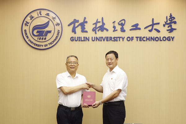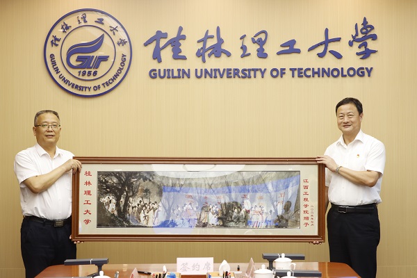 江西工程学院党委书记、督导专员胡涌与桂林理工大学党委副书记、校长王敦球互赠纪念品