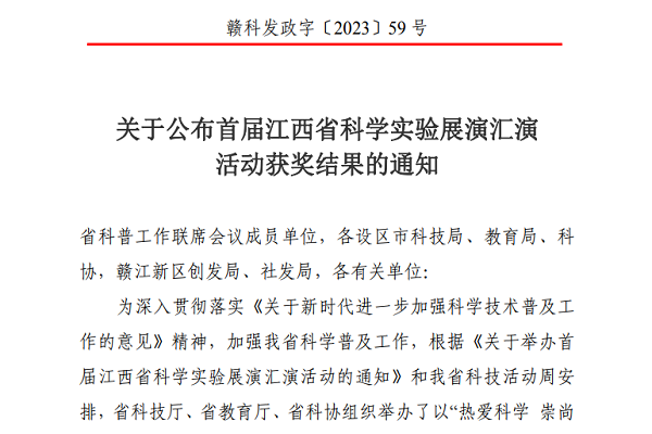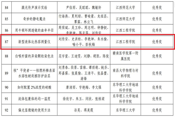 为深入贯彻落实《关于新时代进一步加强科学技术普及工作的意见》精神,加强江西省科学普及工作,根据《关于举办首届江西省科学实验展演汇演活动的通知》和省科技活动周安排,江西省科技厅、教育厅、科协组织联合举办了以“热爱科学 崇尚科学”为主题的首届江西省科学实验展演汇演活动。我校智能制造与能源工程学院刘传安教授,协同学院院长史洪松、彭秋梅副教授及学校实验中心的三位老师,以“新型液体比热容测量仪”的参赛项目参加了此次比赛。