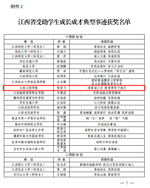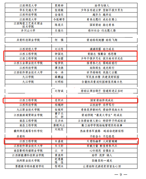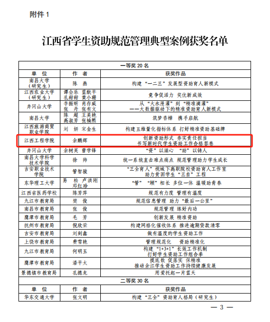 近日,江西省教育厅学生资助管理中心公布了江西省2023年学生资助规范管理典型案例和受助学生成长成才典型事迹评选结果,我校选送的参赛作品荣获江西省学生资助规范管理典型案例一等奖1名、江西省受助学生成长成才典型事迹一等奖1名、二等奖2名、三等奖5名共9篇的好成绩。