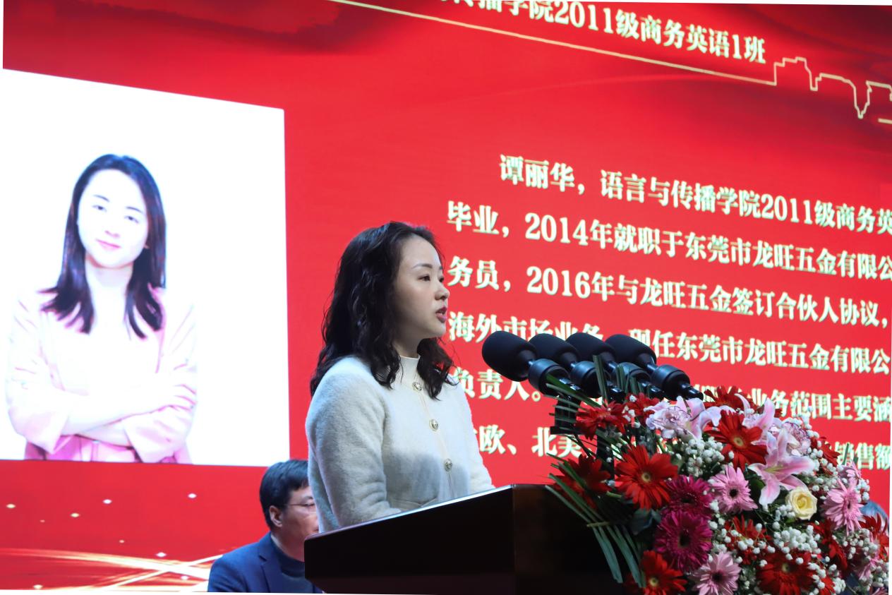 谭丽华,语言与传播学院2011级商务英语专业毕业,2014年就职于东莞市龙旺五金有限公司外贸业务员,2016年与龙旺五金签订合伙人协议,独立承包海外市场业务。现任东莞市龙旺五金有限公司外贸部负责人。精密五金定制服务业务范围主要涵盖区域是北欧、北美,累计运作海外项目订单销售额近2000万美元。
