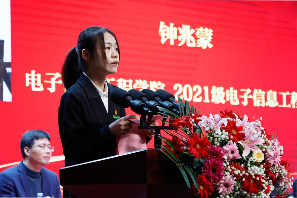 电子信息工程学院2021级电子信息工程2班获奖学生代表钟兆蒙在会上倡议全体同学要明确学习目标,做好职业生涯规划,要有不怕苦、肯吃苦的精神,朝着目标不断前行,让青春在全面建设社会主义现代化国家的火热实践中绽放绚丽之花。