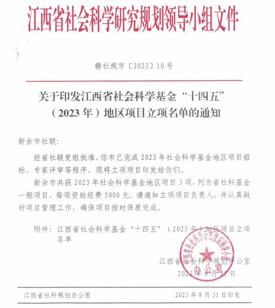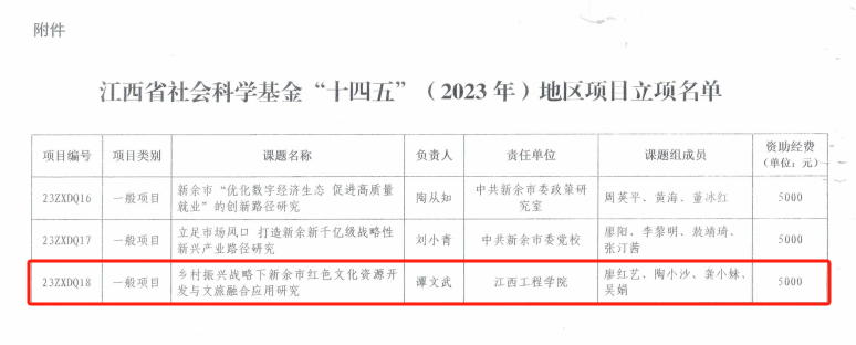 2023年9月,江西省社会科学规划办公室公布省社会科学基金“十四五”(2023年)地区项目立项名单,我校数字经济产业学院院长谭文武副教授申报的《乡村振兴战略下新余市红色文化资源开发与文旅融合应用研究》项目获得2023年度江西省社会科学基金(新余地区)一般项目立项,项目编号号:23ZXDQ18,此项目,我市仅有三家单位获批立项。