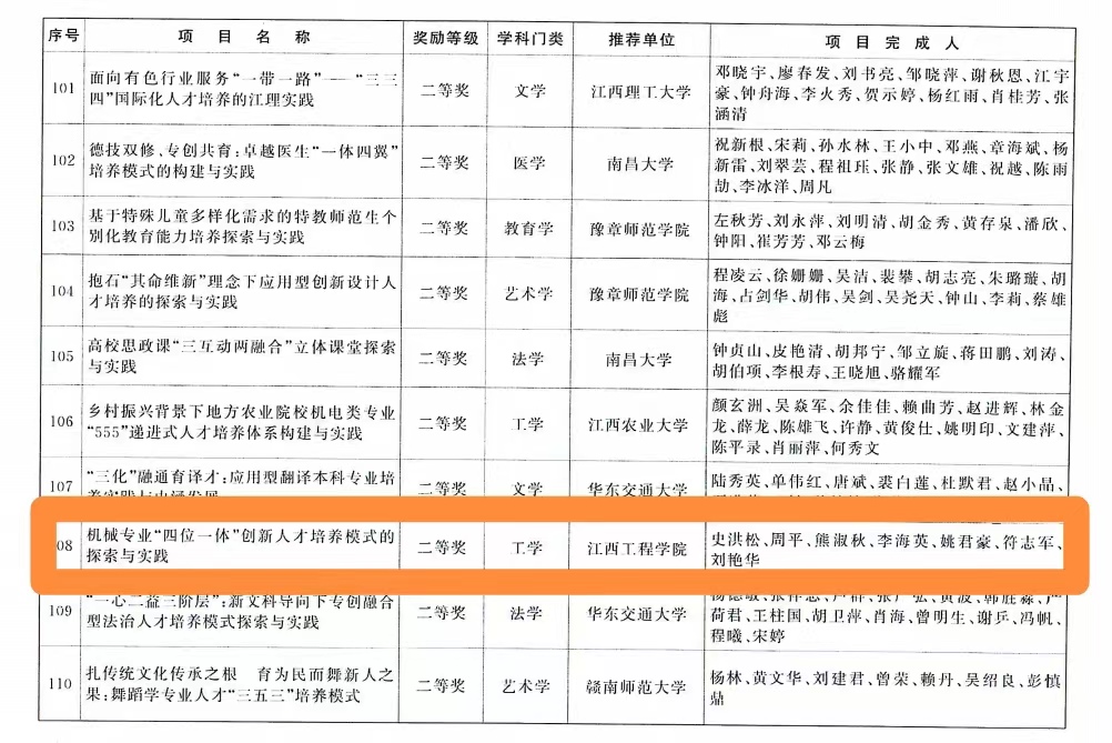 12月28日,江西省人民政府印发《关于2022年江西省教学成果奖授奖的决定》,公布了2022年江西省教学成果奖项目名单。由我校智能制造与能源工程学院史洪松团队申报的“机械专业‘四位一体’创新人才培养模式的探索与实践”项目荣获高等教育类教学成果二等奖,是全省四所民办本科院校获奖的高校之一。据悉,这是首次由省人民政府表彰的教学成果奖励项目,每四年评审一次,奖项含金量高,社会影响力大。