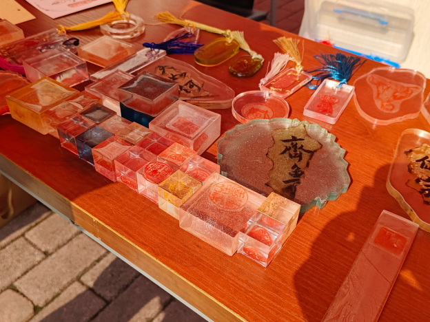 抱石印刻,凝聚着江西新余的深厚文化底蕴,学生们巧妙地将傅抱石篆刻印章融入文创产品创作之中,通过描图、转印、刻章、清洁、试印的动态演绎,以傅抱石印章、书画为主要提取元素,转变传统印章的复杂工艺,结合现代印章新形式,以易呈现的、可DIY的橡皮章进行转化,通过树脂胶、纸艺等方式,呈现“傅抱石文化”中篆刻部分的当代传承方式。这些印章不仅美轮美奂,更承载着深厚的文化底蕴,令人陶醉。