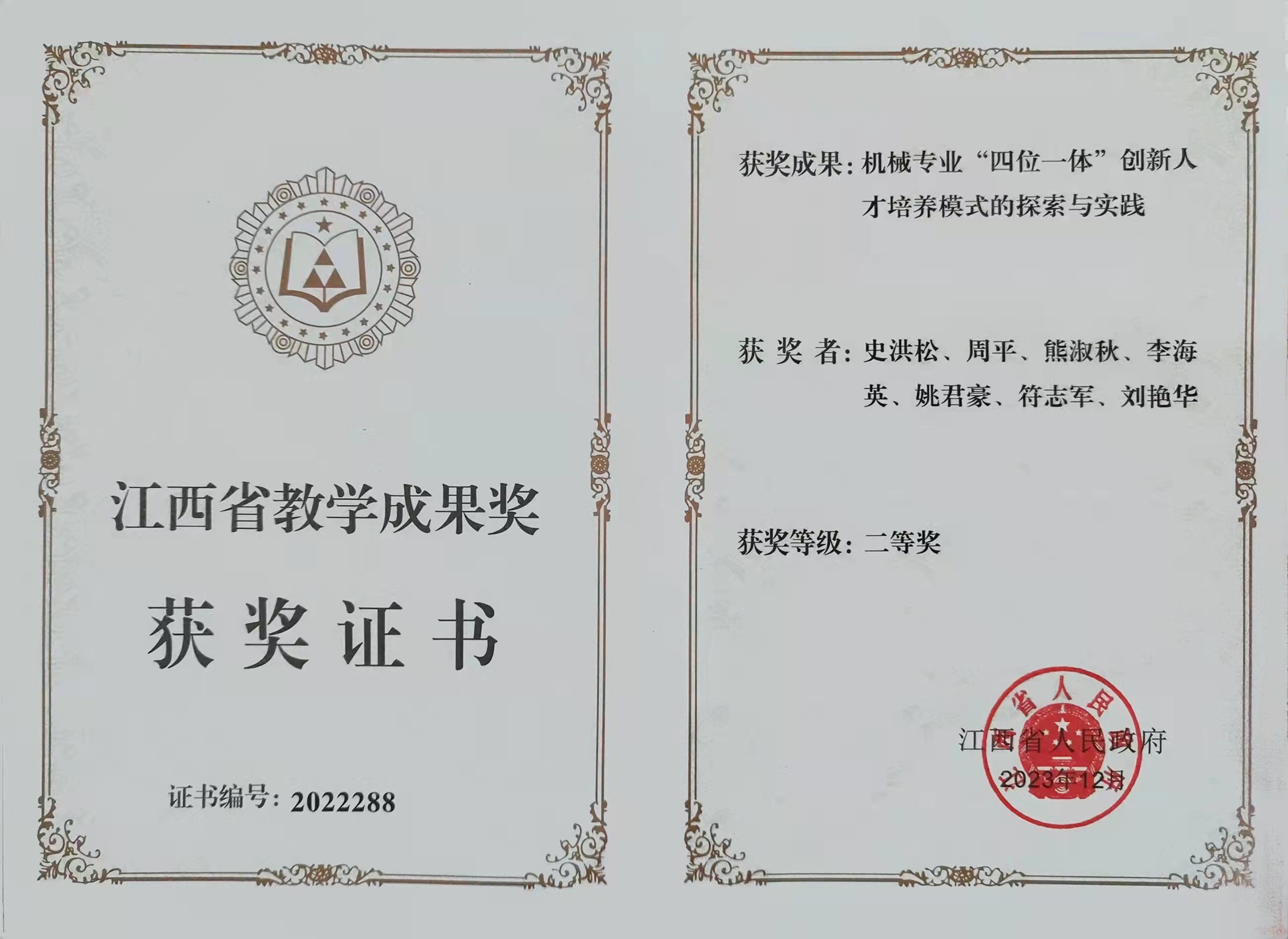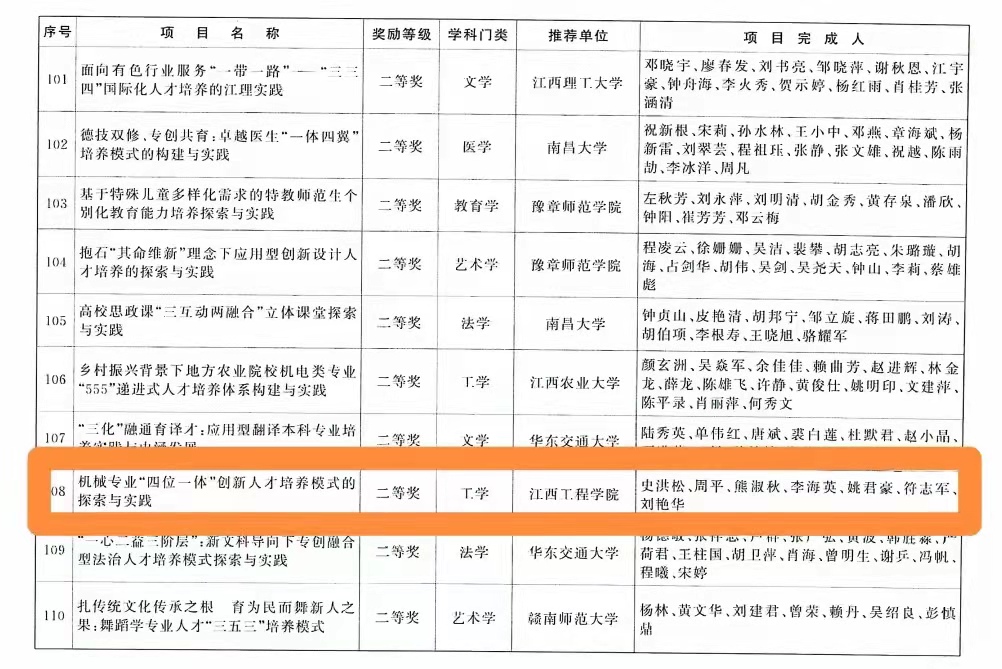 2023年12月28日,江西省人民政府印发《关于2022年江西省教学成果奖授奖的决定》,公布了2022年江西省教学成果奖项目名单。由我校智能制造与能源工程学院史洪松团队申报的“机械专业‘四位一体’创新人才培养模式的探索与实践”项目荣获高等教育类教学成果二等奖,是全省四所民办本科院校获奖的高校之一。据悉,这是首次由省人民政府表彰的教学成果奖励项目,每四年评审一次,奖项含金量高,社会影响力大。
