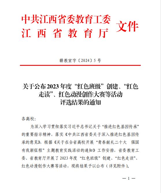 近日,中共江西省委教育工委、江西省教育厅公布了2023年度全省高校“红色班级”创建、“红色走读”、红色动漫创作大赛等活动评选结果名单,我校再次取得突破,获得优异成绩。