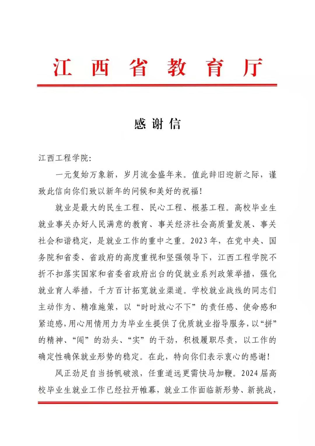 2024年1月,我校收到了一封来自江西省教育厅的感谢信,这封信不仅是对我校就业工作的认可,也表明了学校一直以来对于就业工作的重视与坚持。一直以来,学校将坚持以“促进毕业生更加充分、更高质量就业”为目标,不断创新工作思路,完善工作机制,提高工作水平,进一步强化就业育人建设,引导大学生树立正确的就业观和择业观,为学生提供更优质、更精准、更高效的就业服务,促进毕业生高质量充分就业。